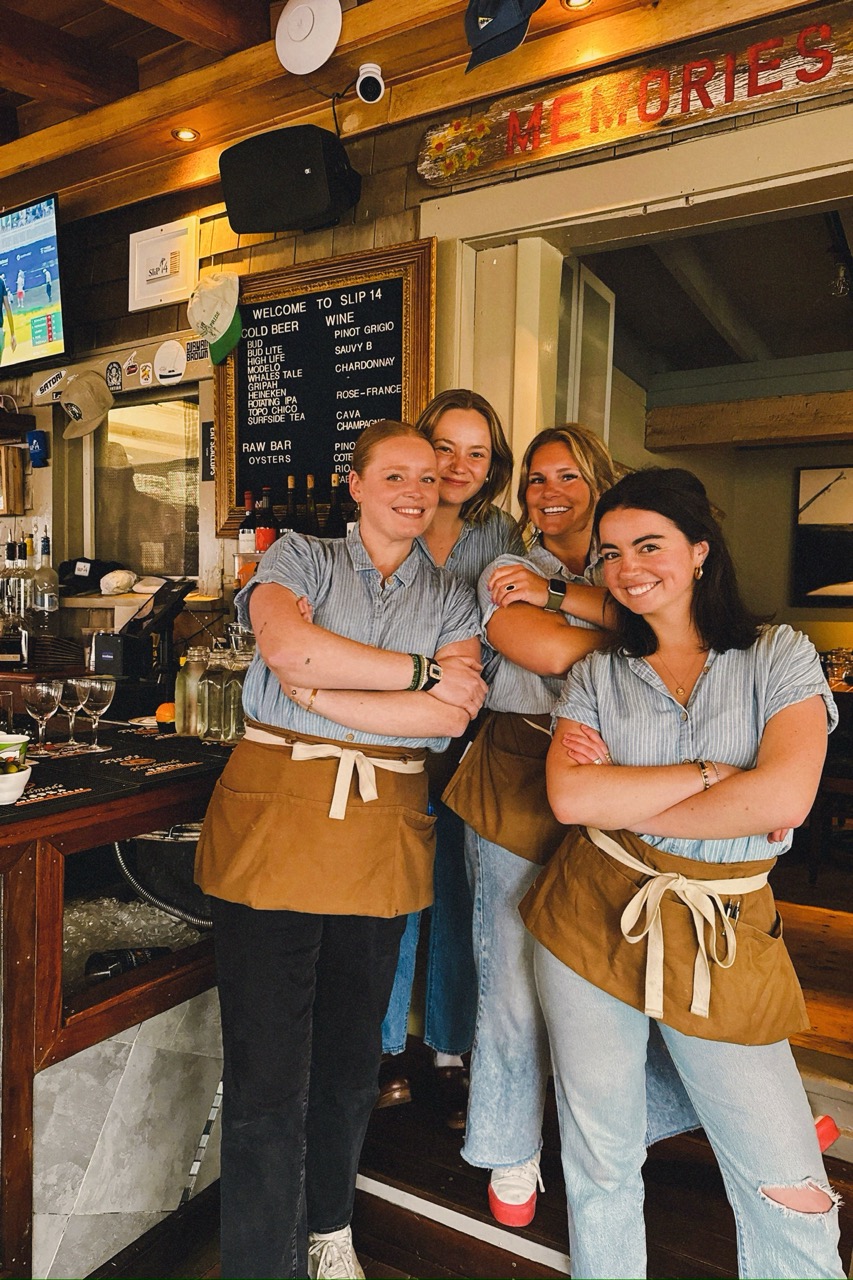 Nestled at the end of the iconic Old South Wharf, Slip 14 has been a special gathering place for locals and visitors alike for the past 21 seasons. What began as a laid back fishermen's haunt has grown into a beloved summer tradition - where familiar faces return year after year, and new guests quickly feel like part of the family. Owners Brennen Connor and Timothy Farley took over Slip 14 from local fisherman, Jonas Baker, in 2021 and have kept the values of a laid back but vibrant atmosphere very much alive. Sourcing food from local farmers and fishermen, our coastal fare brings the taste of Nantucket to every dish. Our bar program offers incredible summer cocktails, local beers, and an undeniable energy that’s sure to bring a smile to your face.